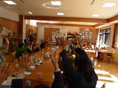 最後はご本人様から『みんなでバイザイがしたい!!』と。全員で万歳をして百寿を祝いました。