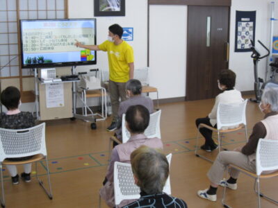 当日は、①ミニ講義『コレってもしかして……認知症?」②でん伝体操 ③ゲーム「輪投げ」&楽しい運動という内容で開校しました。