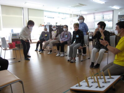 輪投げでは「今日は、ちょっと腕が痛くて、上手く投げられないの」など前置きをしながらの投球。「大丈夫、大丈夫。年をとれば、皆どこもかしこも痛みが出てくる。痛いところは皆同じ」など合言葉のように言いながら、、、「家じゃ、こんな大きな声で笑えないよ。ほんとここは楽しいね」と大笑いしながら楽しい時間を過ごしました。