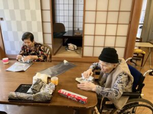 清響1階で焼き芋を行いました。芋を新聞紙で巻くところから手伝っていただき一緒に行いました。