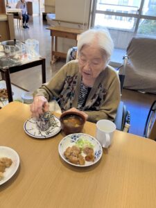 普段は職員の介助で召し上がることが多い利用者様もご自分で持って食べる事ができ、その姿を見て職員も思わず笑顔になる素敵な時間を過ごすことが出来ました