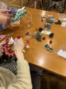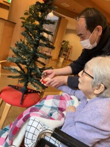 食後のレクリエーション活動では、クリスマスツリーの飾り付けや