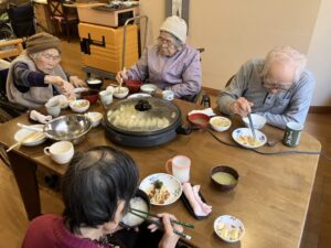 毎月1回程度昼食で蒸し餃子が出るのですが、入居者様から「焼き餃子も食べたいな」との声があったため企画を立てました!餃子は栄養士にホットプレートで焼いてもらいました。